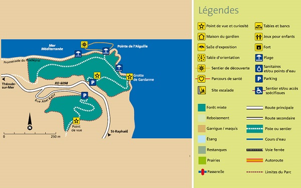 Randonnée pédestre : au-dessus de la corniche de l’Estérel, un sentier conduit en peu de temps au belvédère. Le parc étant constitué, dans sa partie littorale, de falaises plongeant dans la mer, il est indispensable de suivre les sentiers aménagés.