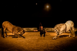Cavaliers, dresseurs, danseurs, acrobates, acteurs, chanteurs, jongleurs de feu… les artistes marient leurs répertoires techniques et leurs univers esthétiques et poétiques pour livrer un spectacle équestre de haute maîtrise à l’âme burlesque, moderne et sensible.