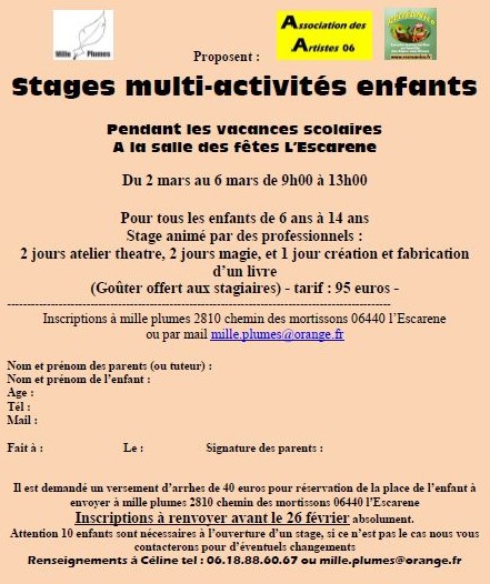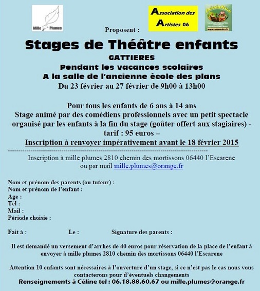L'Association des artistes et Mille plumes vous proposent un stage de Théâtre pour enfants à Gattières et un stage multi-activités à l'Escarène, pendant les vacances de février 2015.